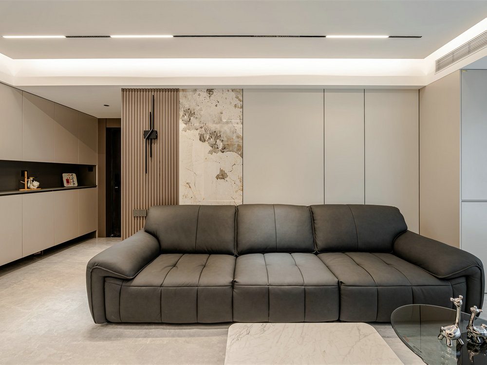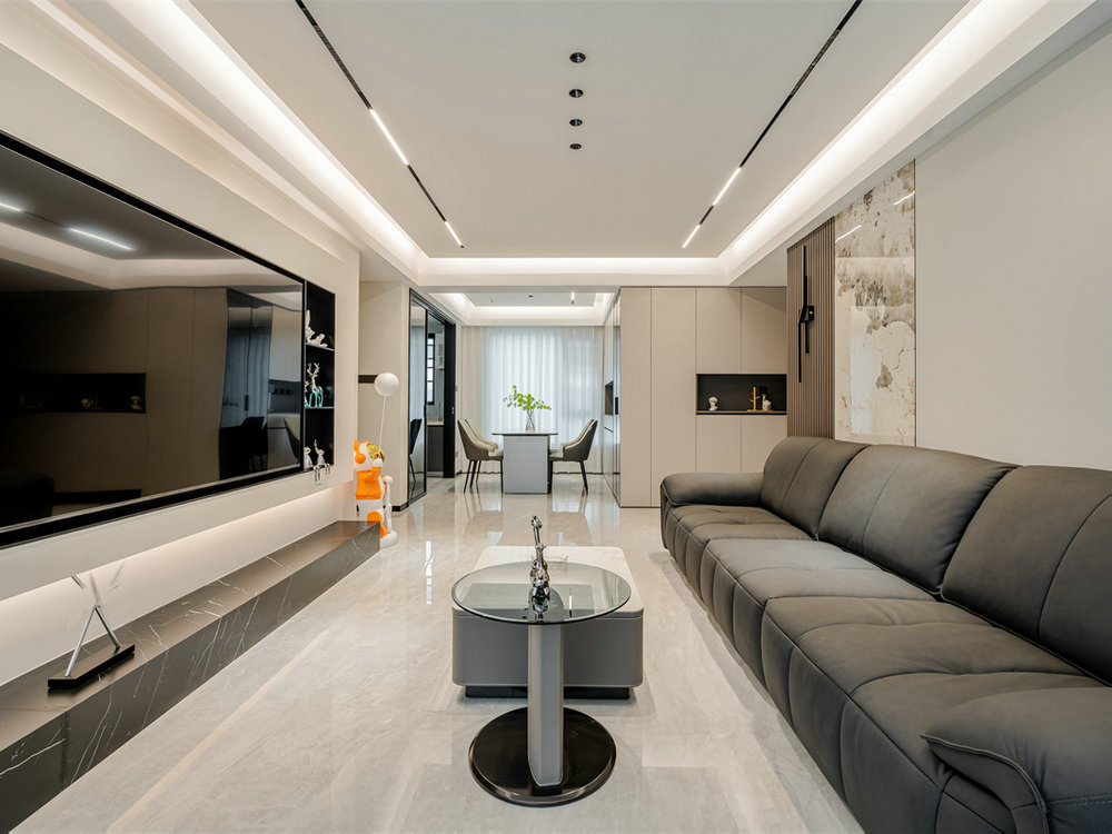 客廳采用全屋無主燈設(shè)計,內(nèi)嵌筒燈+燈帶營造層次感,空間感瞬間放大!地面鋪設(shè)大體塊亮面磚,淺色基底增強(qiáng)整體延展性。