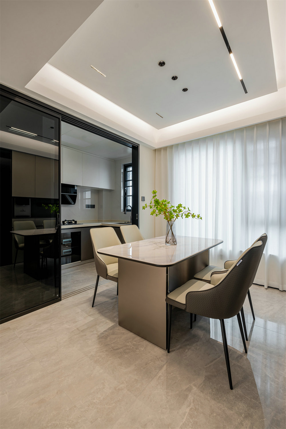 餐廚空間采用開放式設(shè)計,餐桌作為空間錨點,與客廳形成視覺延伸。廚房借用黑框玻璃推拉門相隔,借此保持空間的通透性和靈活性。