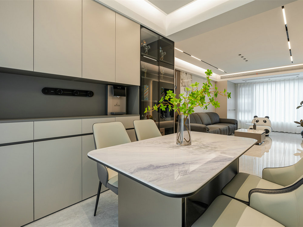 餐桌采用魚肚白大理石,借以簡練的調(diào)性圈出內(nèi)斂品味。周圍擺放四張餐椅,一家人可以坐在一起用餐。加之綠色植物點綴空間,讓人每時每刻都能保持愉悅的心情。