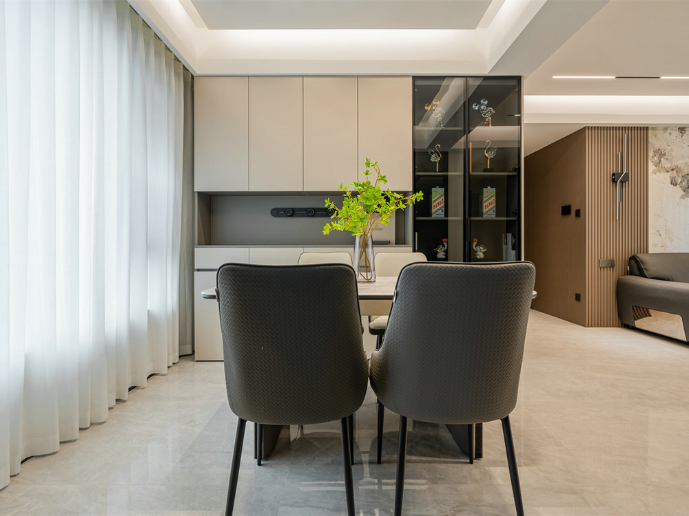 定制餐邊柜沿墻面展開,由此提供了充沛的收納空間??姘鍦厝岽髿?,內(nèi)置感應(yīng)燈帶,玻璃門設(shè)計有效兼顧了展示與防塵需求。