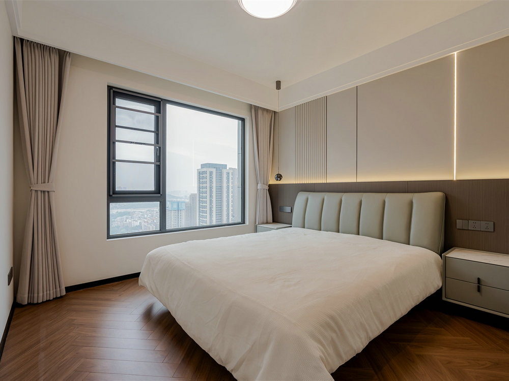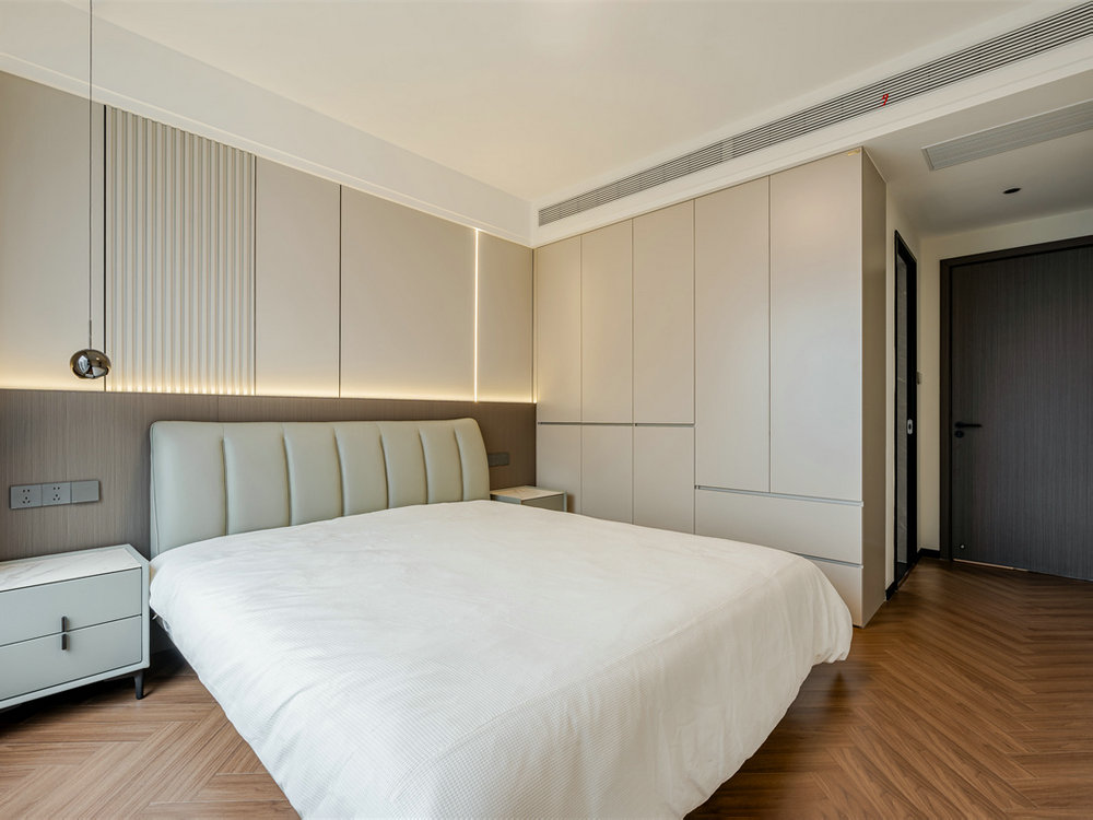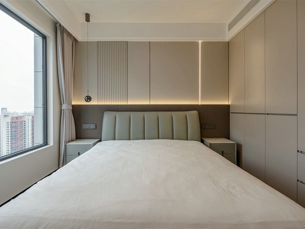床頭背景墻選用墻板+木飾面的組合,同時引入豎條紋的裝飾設(shè)計,強(qiáng)化了墻面的立體感和視覺趣味。加之暖光燈帶的輔助搭配,具備顯著的洗墻效果。