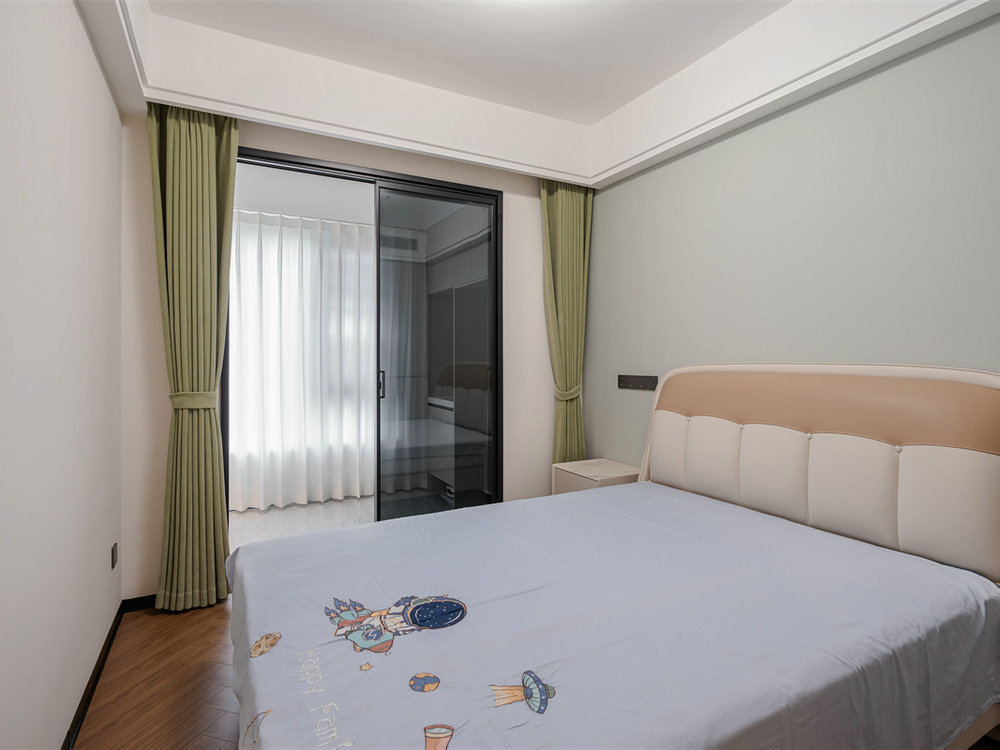 次臥同陽臺保持極強(qiáng)的聯(lián)動性,采光更明亮通透。同時采用黑玻推拉門+極窄邊框設(shè)計,保持立面整潔,提升更多美觀度。