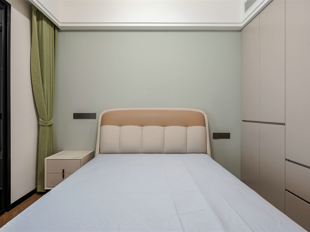 次臥墻面選用霧都綠色,搭配摩卡棕床頭,打造溫馨睡眠環(huán)境。衣柜和床體之間留出足夠的通行寬度,同時確保衣柜開門不受影響。