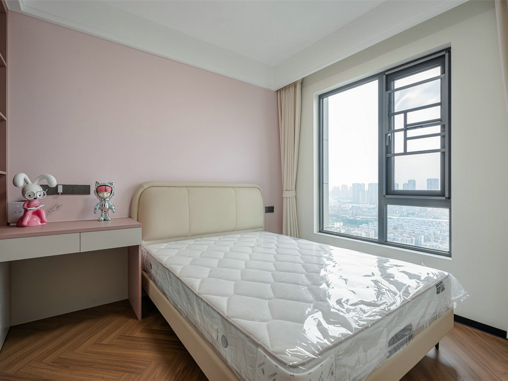 兒童房采用藕粉色作為空間基底,搭配珍珠白裝飾線條,營造出溫暖舒適的氛圍。窗簾選擇同色系材質(zhì)形成色彩呼應(yīng),既凸顯明亮度又保障透氣性。