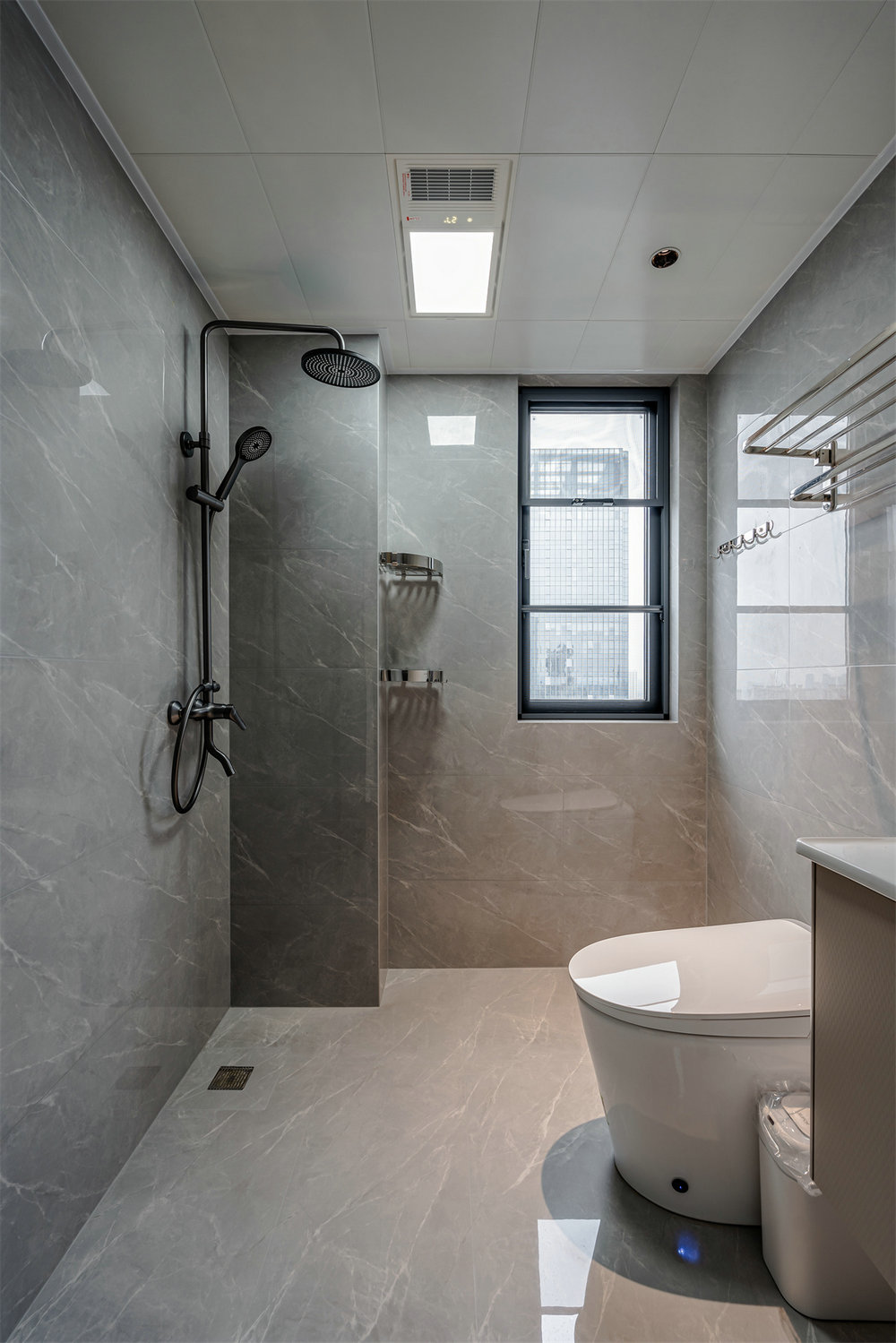 主衛(wèi)墻面和地面統(tǒng)一選用灰色大理石,增強(qiáng)防滑性能的同時形成視覺過渡。浴室柜和淋浴區(qū)位于不同側(cè),這樣的話業(yè)主在使用時不會受到限制。