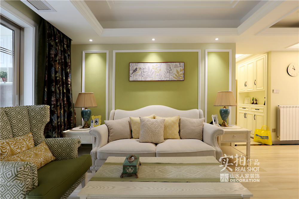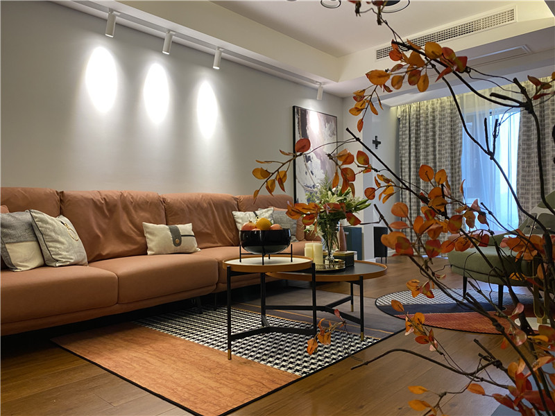 客廳采用無主燈的設計手法,讓頂面更加簡潔干凈,光線分布更均勻。地面通鋪淺色地磚,地毯界定休息區(qū),提供舒適環(huán)境。旁邊墻面裝飾融合深綠、灰黑,與家居色彩形成連貫性,很有森系的味道。