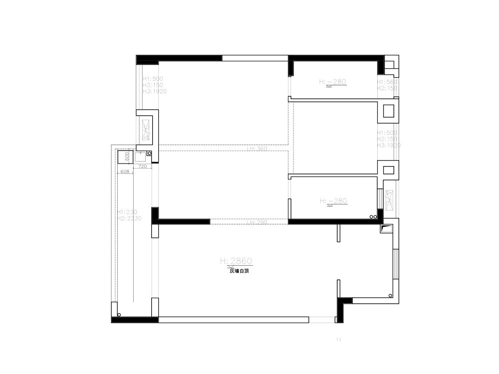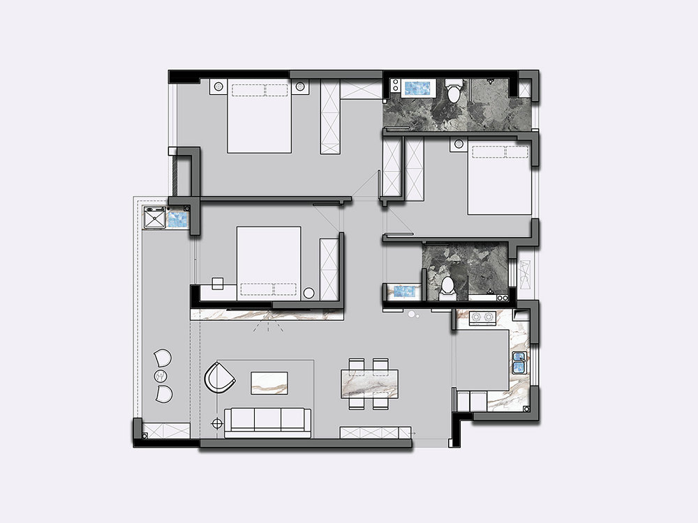 本案戶型方正,為保障空間通透感,對(duì)房型做出如下調(diào)整:(1)打通客廳、陽(yáng)臺(tái)及次臥,強(qiáng)化整體采光,并形成優(yōu)良溯回動(dòng)線;(2)客餐廳一體,廚房做成半開(kāi)放式,增加家庭互動(dòng)性;(3)衛(wèi)生間均實(shí)現(xiàn)干濕三分離,以提升體驗(yàn)感。