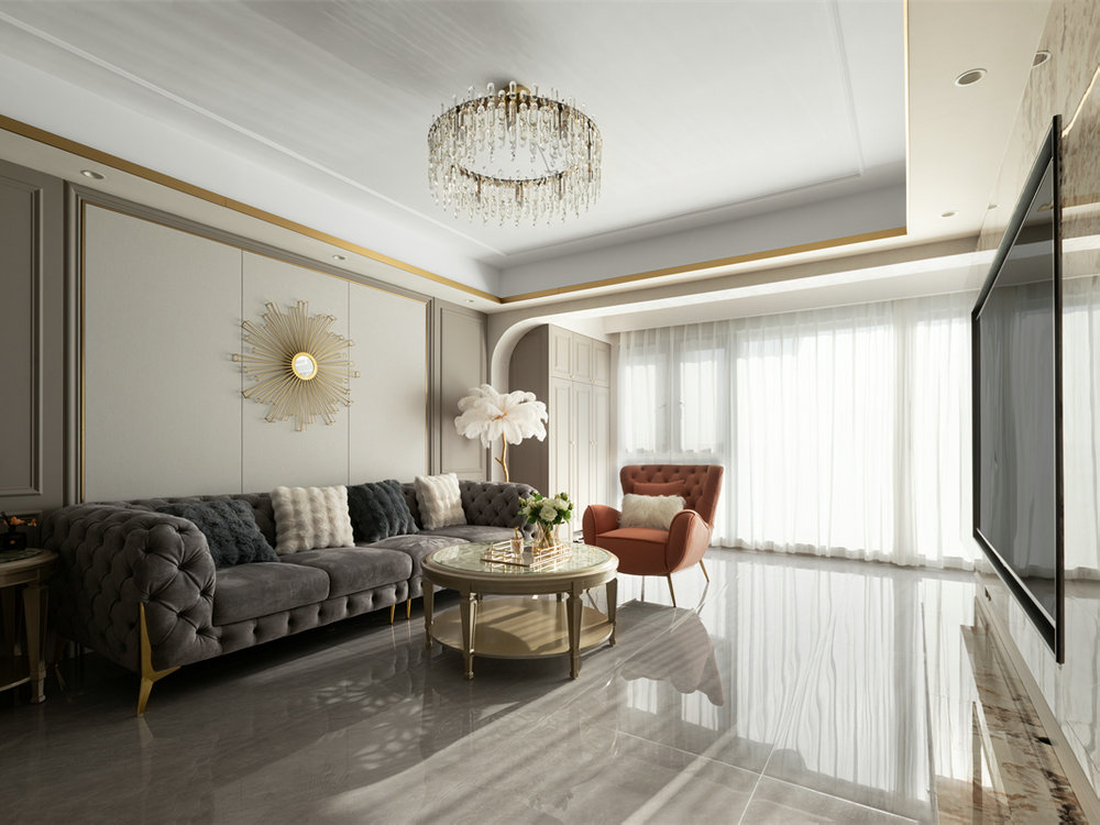 落地窗配白紗簾引入自然光,半弧形門洞設(shè)計(jì)愈加柔化空間。頂部配置了水晶大吊燈,以提供主照明,兩側(cè)金色垂直線條延伸至天花板,強(qiáng)化縱向空間感。地面則通鋪亮面灰色瓷磚,更顯奢闊大氣。