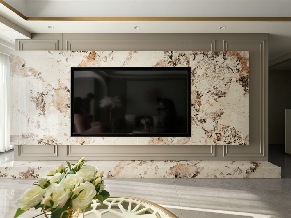 電視背景墻采用淺米灰底色大理石,表面分布深灰色斑點(diǎn),賦予空間低調(diào)奢華感。電視居中嵌入,純黑屏幕邊框與淺色石材形成強(qiáng)烈反差。下方延伸出同材質(zhì)懸浮式地臺(tái),兼具展示功能與視覺(jué)輕盈感。