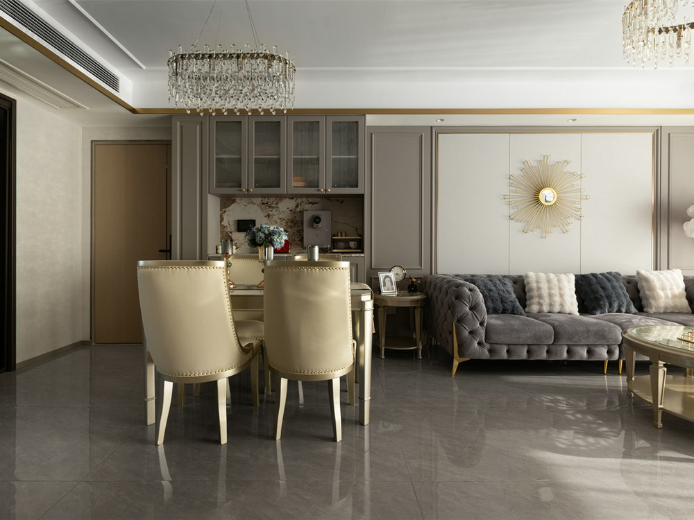 客餐廳采用開(kāi)放式一體設(shè)計(jì),空間面積大,視野開(kāi)闊明朗。整體以灰色+米色奠沉穩(wěn)主調(diào),金色裝飾細(xì)節(jié)貫穿始終,營(yíng)造高貴舒適感。