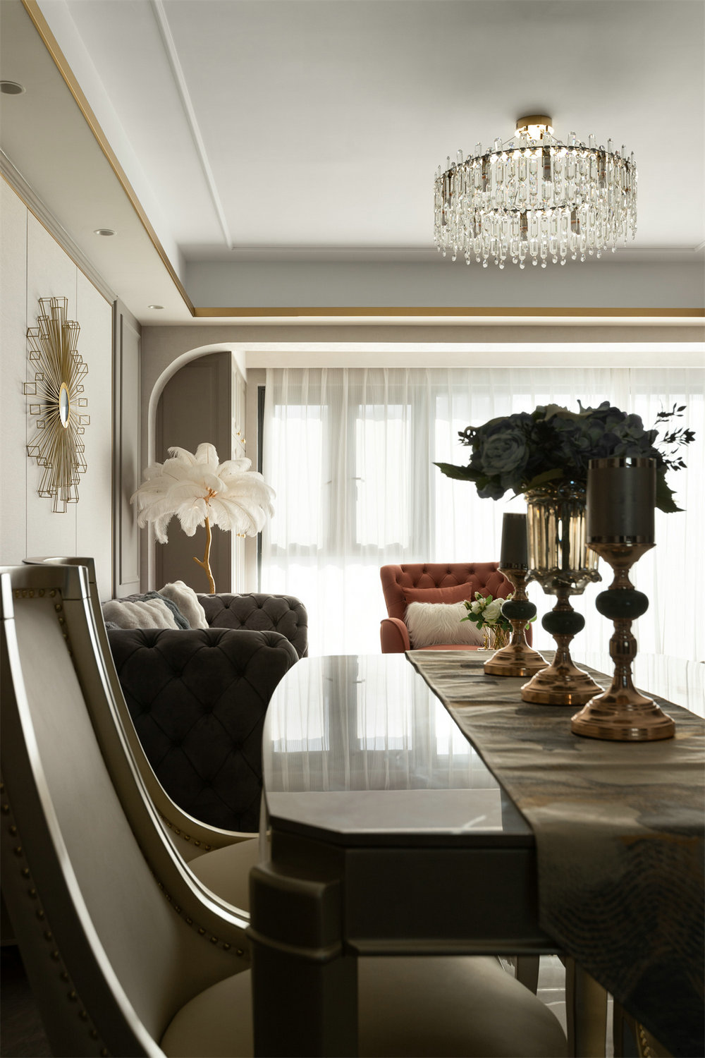餐桌選用雪花白配色,結(jié)合橢圓曲面桌面,這樣能消除直角帶來(lái)的視覺(jué)壓迫感,更好適配家里的環(huán)形生活動(dòng)線。其中裝飾擺件極富考究,用到桌旗、深紫花藝及金色燭臺(tái)等,共同迎合了典雅精致的用餐環(huán)境。