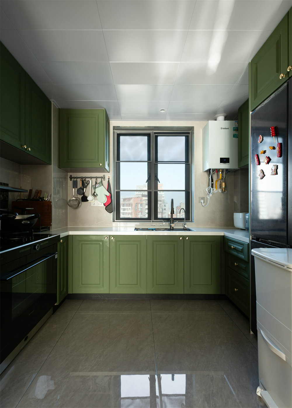 廚房選用墨綠色櫥柜,形成清新時(shí)尚的視覺(jué)體驗(yàn),增添不少生活氣息。白色石英石臺(tái)面延伸出寬闊操作空間,旁邊還內(nèi)嵌了黑色雙開(kāi)門冰箱,有效提升使用效率。
