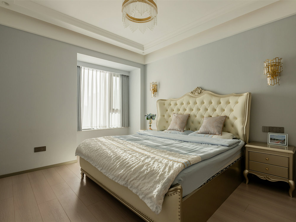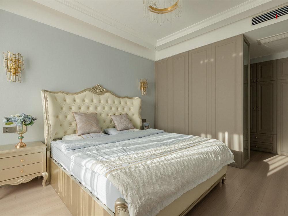 主臥采用淺灰藍(lán)墻面,搭配米白色皇冠床頭,給人一種清新舒適的感覺(jué)。兩邊懸掛了金色壁燈,形成對(duì)稱視覺(jué)軸線,再加上床頭柜臺(tái)燈的輔助,打造宜人的氛圍光,有利于助眠。