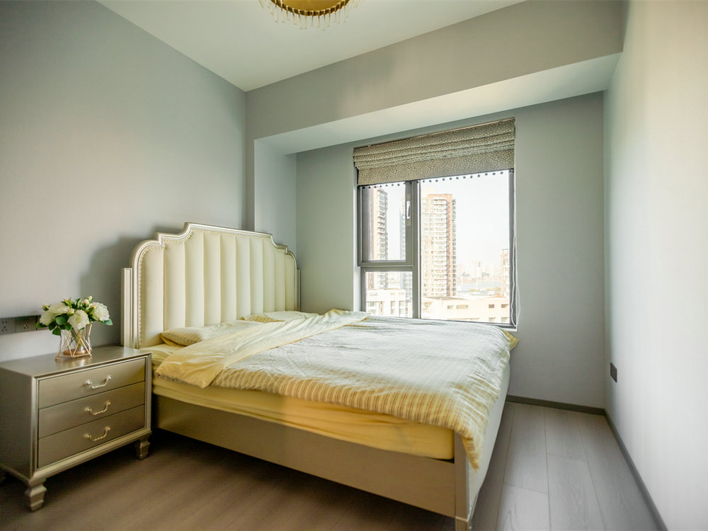 次臥大量應(yīng)用清新自然色調(diào),結(jié)合地面溫潤(rùn)木地板,避免視覺(jué)疲勞。床體緊靠窗臺(tái),精簡(jiǎn)空間的同時(shí),引入更多自然光,打造舒適愜意的臥室氛圍。