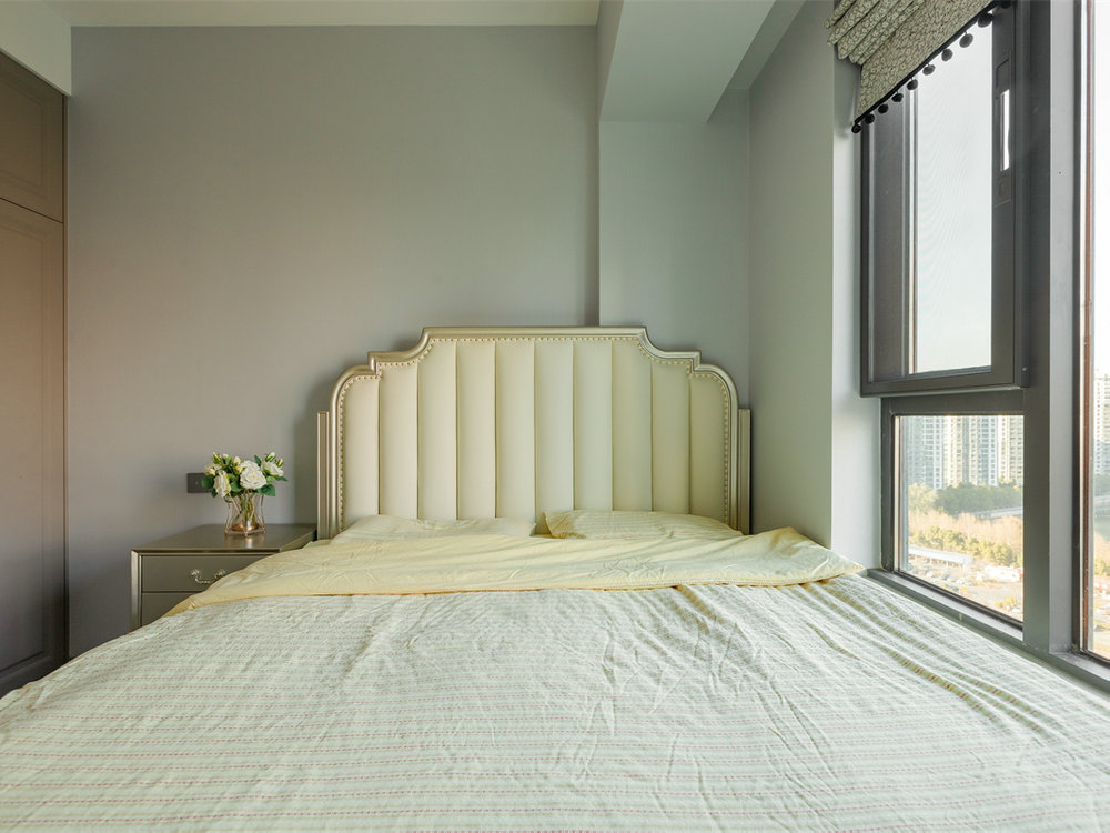 次臥選用米白色軟包床頭,搭配同色系床飾,進(jìn)而柔化視覺(jué)沖擊。旁邊定制到頂?shù)囊鹿?,冷暖色交融提升空間層次感。