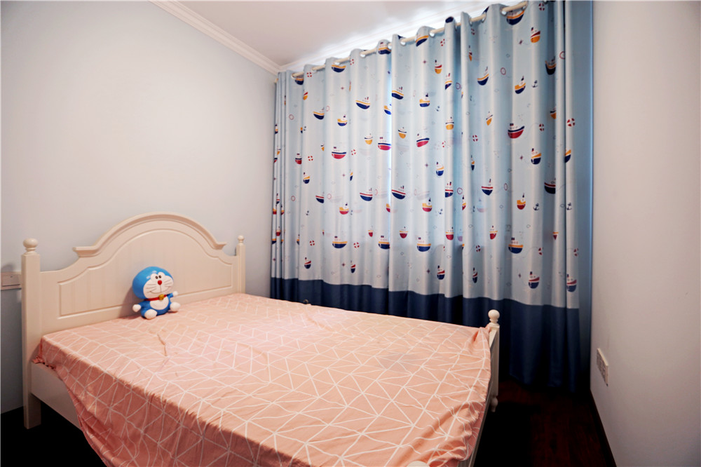 兒童房是留給還沒出生的小寶寶用的,藍色碎花窗簾和木質床具活潑又不失溫馨。