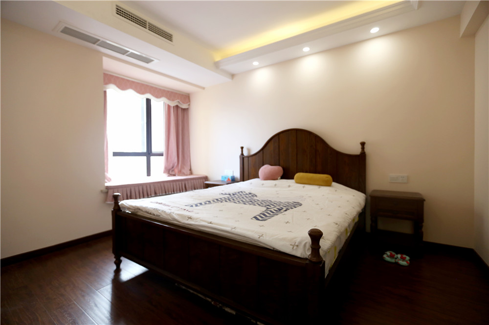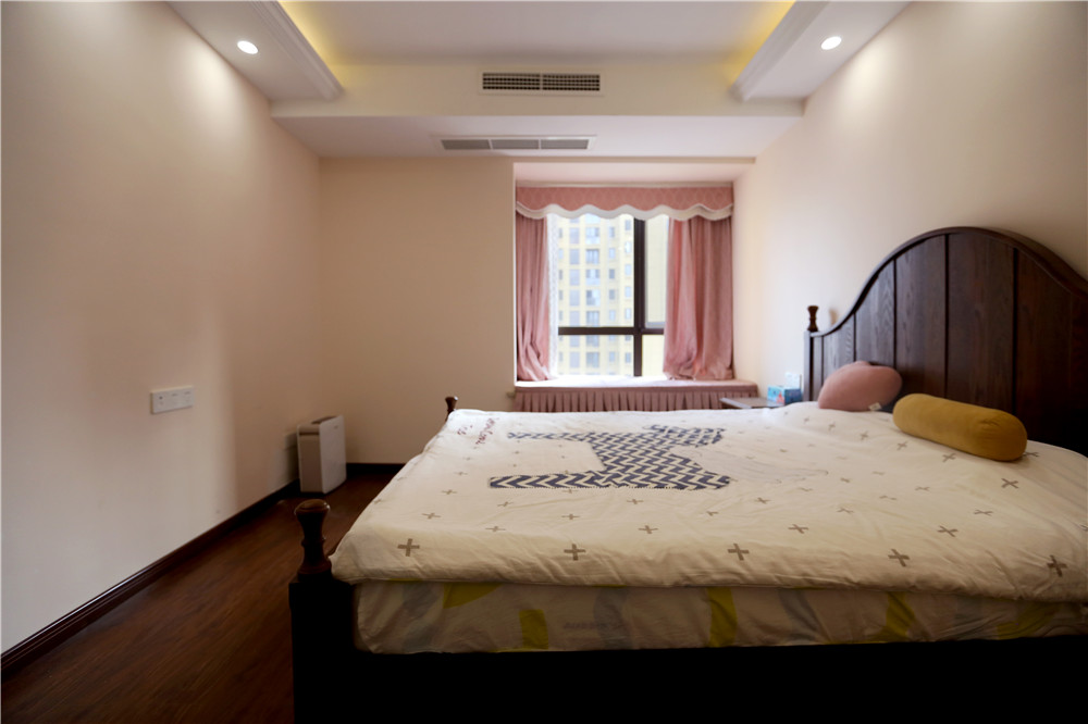 粉紅色窗簾與姜黃色乳膠漆搭配出暖色的感覺,在木質地板復古味道的襯托下,讓人沉浸在一種舒適放松的環(huán)境下。