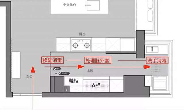 換鞋(鞋柜)- 收納外出的臟衣服(衣柜)- 洗手消毒(洗手盆兼顧洗衣區(qū)手洗衣服池)完成整個(gè)動(dòng)線,結(jié)束后,在過(guò)程中大量的細(xì)菌病毒被處理掉,避免帶入家庭的公共空間和私人空間